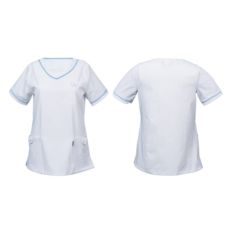 Cette tunique dispose d’un col en V, de manches courtes, d’un contraste à l’encolure et aux manches et de trois poches (deux basses et une poitrine) pour garder vos essentiels à portée de main.