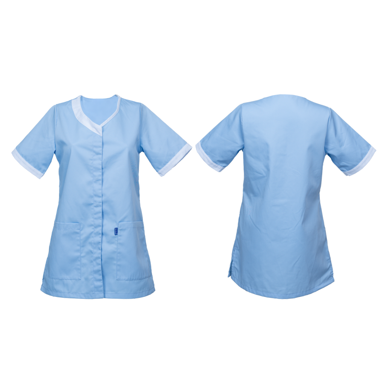 Cette tunique dispose d’un col en V, de manches courtes, de deux poches latérales et de fentes d’aisance pour une liberté de mouvement optimale.
