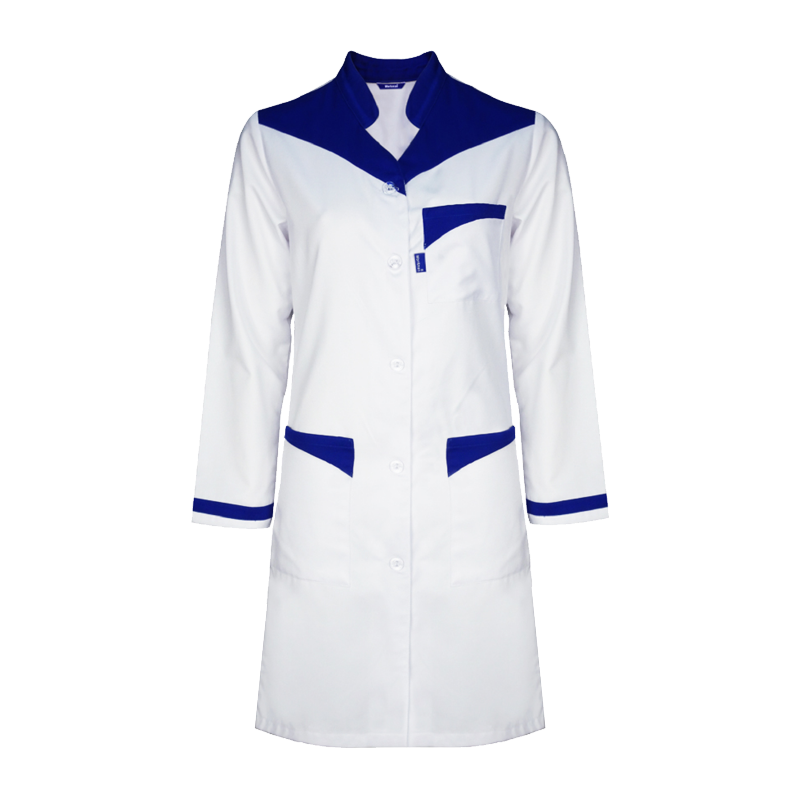 Ce tablier de travail femme, doté d'un col chemisier contrasté, offre une allure professionnelle tout en permettant une grande liberté de mouvement.