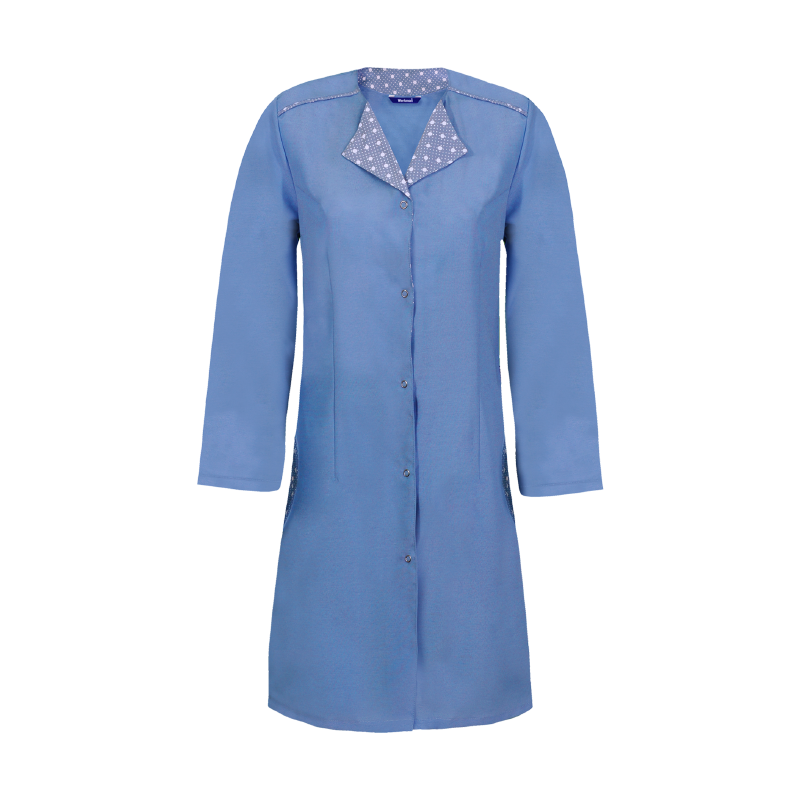 Ce tablier de travail femme, doté d'un col chemisier contrasté, offre une allure professionnelle tout en permettant une grande liberté de mouvement.