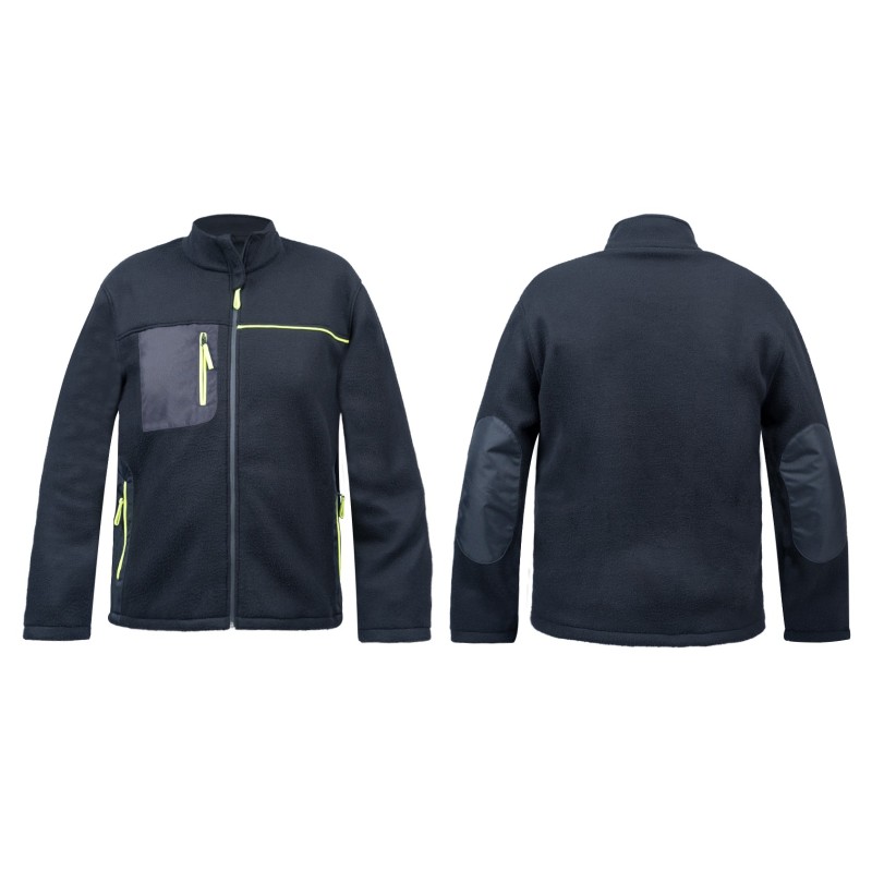 Cette veste dispose d’un col cheminée, de poches latérales et poitrine zippées fluorescentes, d’une découpe avant avec biais fluo côté cœur et de renforts aux coudes pour un confort et une durabilité optimale.